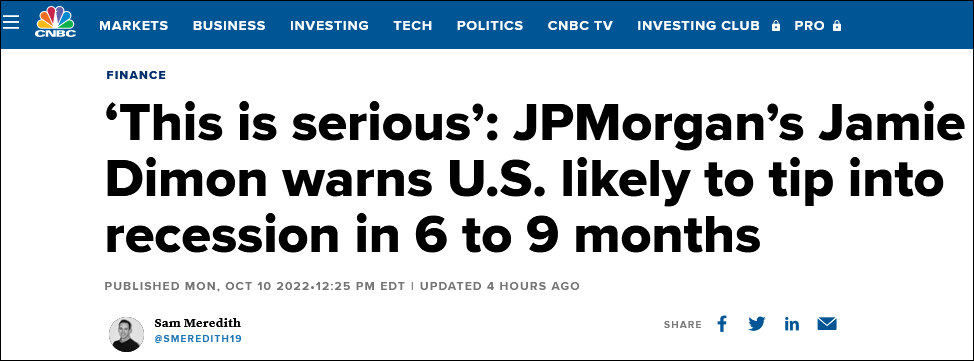戴蒙说:“这些都是非常非常严重的问题,我认为这些问题很可能会推挤美国和全球经济,我的意思是,欧洲已经陷入衰退,这些问题可能会使美国在6个月到9个月后陷入某种衰退。”