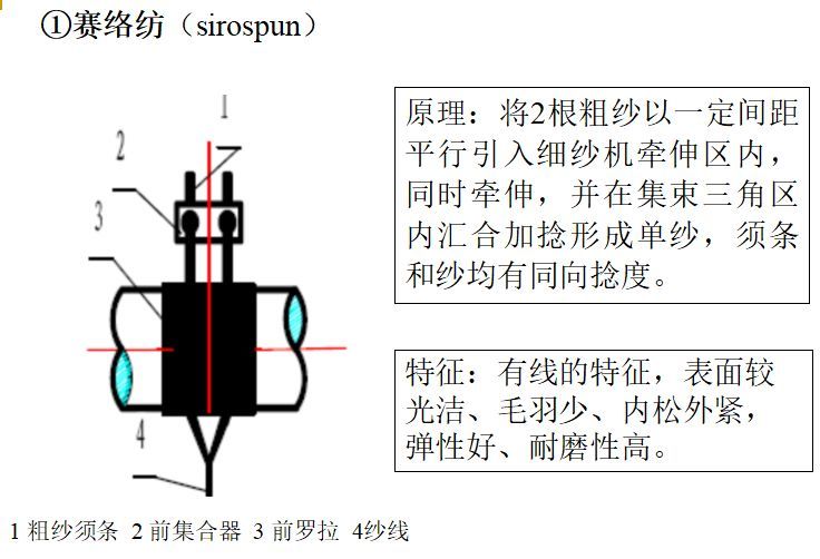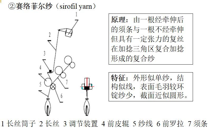 复合纺纱:如塞络纺纱(sirospun yarn)、塞络菲尔纺纱(sirofil yarn)